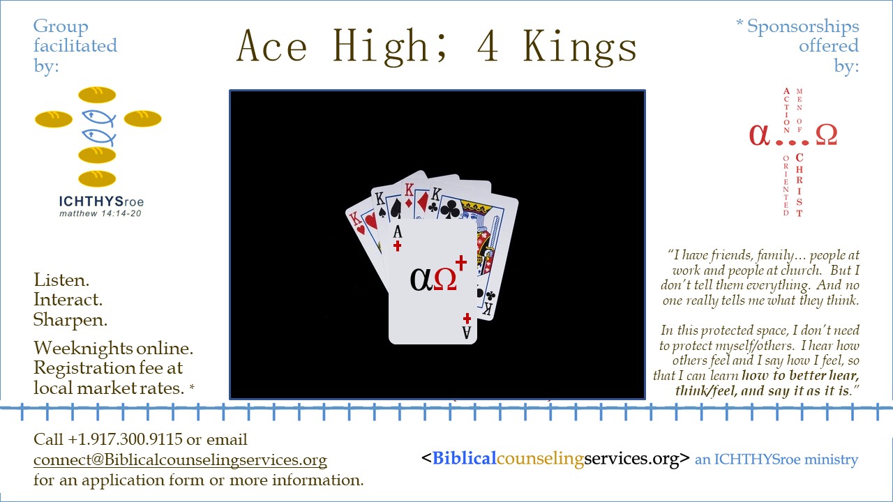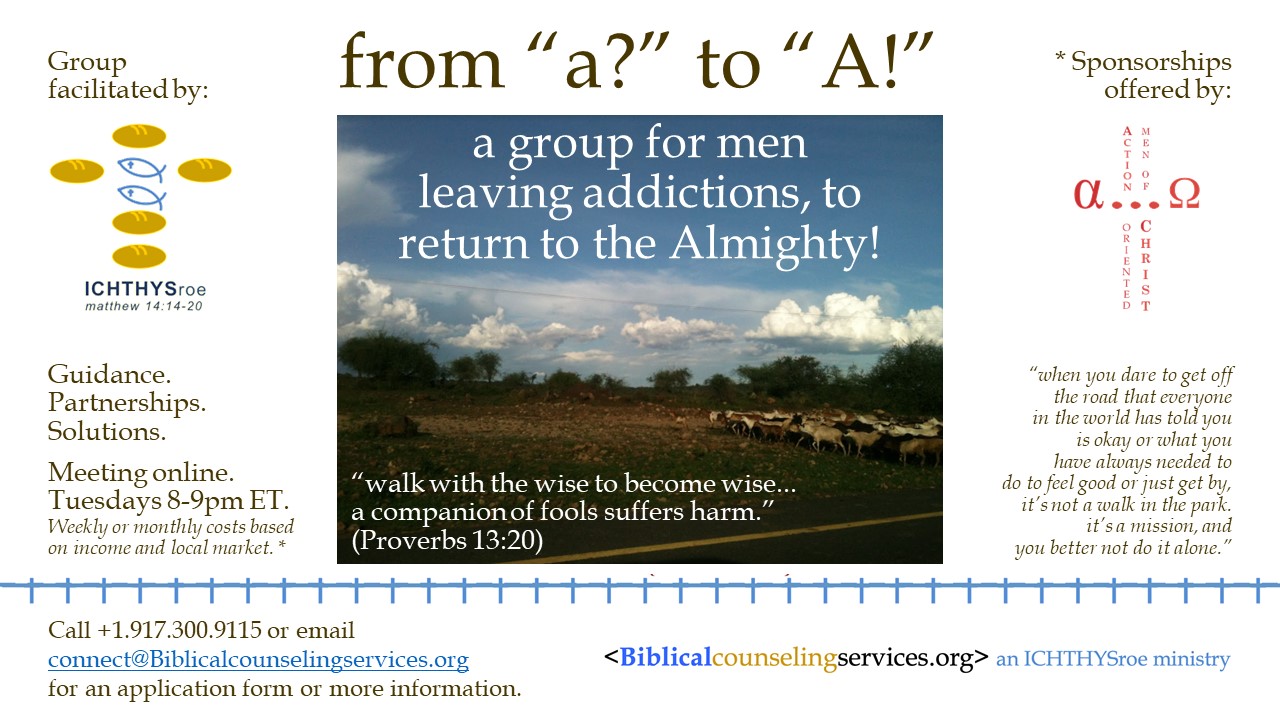 As an organization that strives to live by Biblical principles in order to seek healing and pursue growth for (ourselves and) others in community, ICHTHYSroe provides groups to reconnect members and clients to the body of Christ.